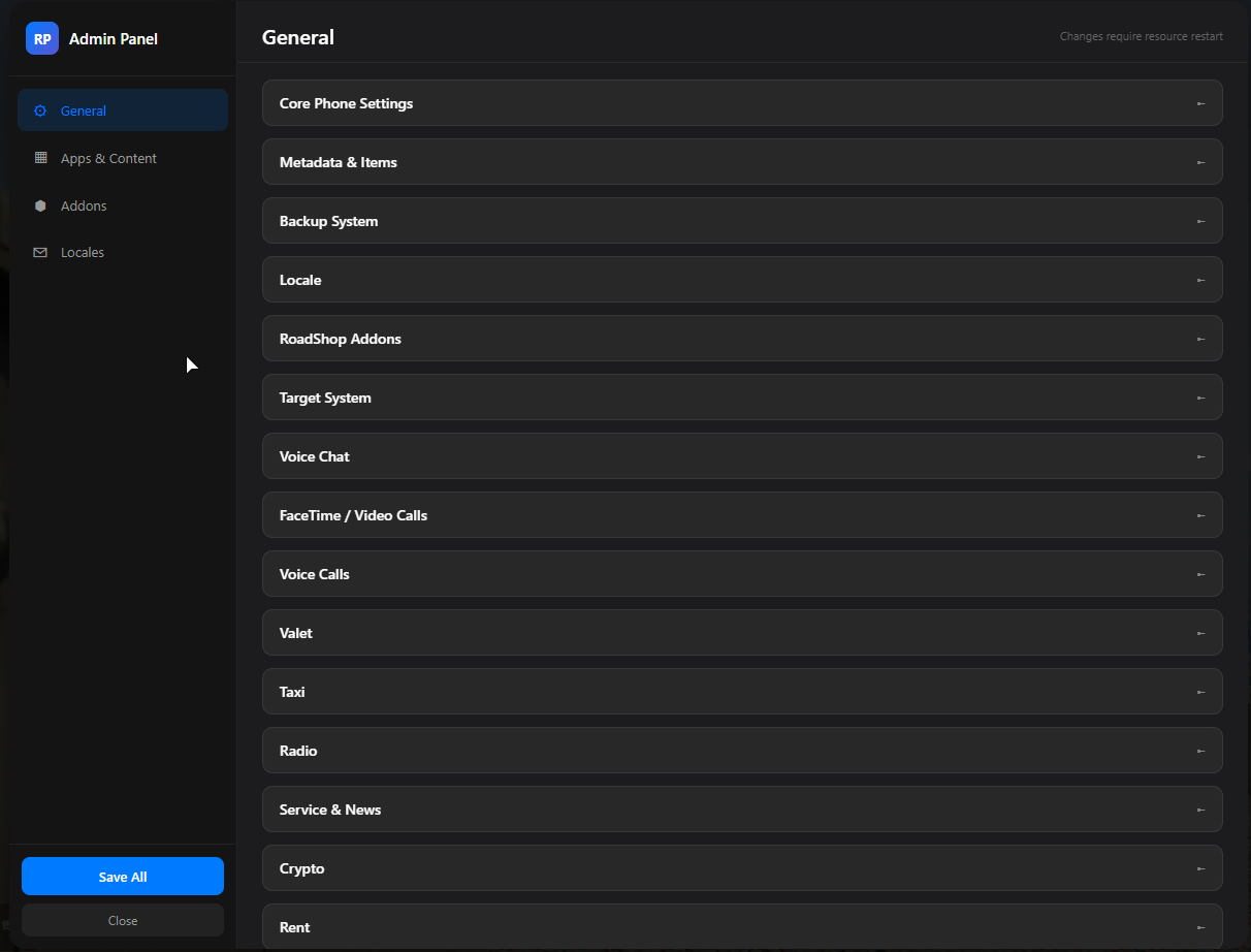The Admin Menu is an in-game panel that lets you edit RoadPhone-Pro’s configuration files (config.lua, config.json, addon configs, and locales) directly from inside FiveM — no manual file editing or FTP uploads required.
